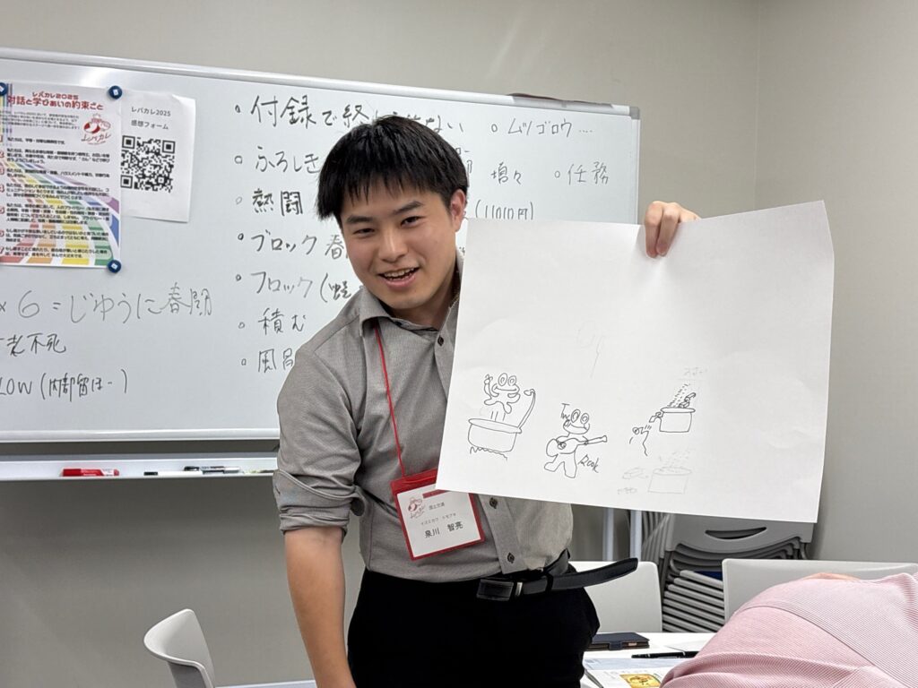 26で「フロ」だからフロッグでキャラクターがカエルとなり、賃上げで社会を「変える」メッセージ性を確認。職場や家庭で触りながら春闘を自覚するグッズ(握れるボールのようなもの)や、富裕層が受け取る報酬の1万円札の数と同じ重量を表す分銅等を作るといったアイデアなどが次々と生まれ、爆笑の渦が起こりました。
