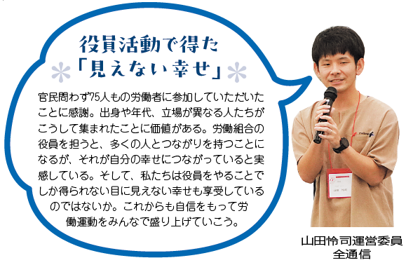 人のためになる仕事がしたい、社会を良くしたいという高い志を持って働きはじめた公務員は多いと思うが、長時間過密労働や能力実績主義によってその志が簡単に奪われている。国公労働運動はそうした問題を制度面から解決していくものと思うが、一人ひとりが参加して考えるだけで奪われたものの半分は取り戻せていると感じている。いつもとは違う大きな視点で物事を捉えるという、こうした機会を今後も大切にしていきたい。