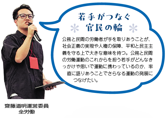 組名活動をする上で連なりと繋がりを非常に大切にしてとりくんでいる。連なりについては、これまでの闘争、歴史について繋がれてきたものと捉えている。今ある制度が当たり前と感じている若手職員も多いと思うが、その背景には制度の変革の歴史があり、変革を勝ち取るために、様々な運動と、そこに多くの方が力と時間を注ぎ、築かれたかという歴史を学ぶ必要がある。私は全労働青年協議長を務めていることから、次世代にたすきを渡していくということでは、青年協の活動は非常に近く、その中心にあると考えている。今後の組合運動にしっかりと継承するという意識でとりくんでいきたい。また、繋がりについては、要求実現のためにも単組を超えた横の繋がりを大切にしていきたい。